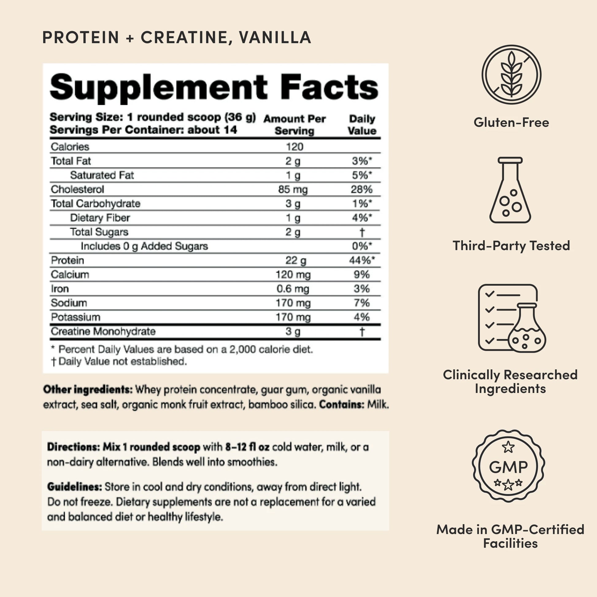 - Protein + Creatine Vanilla: Whey Protein Concentrate, Guar Gum, Organic Vanilla Extract, Sea Salt, Organic Monk Fruit Extract, Bambo Silica