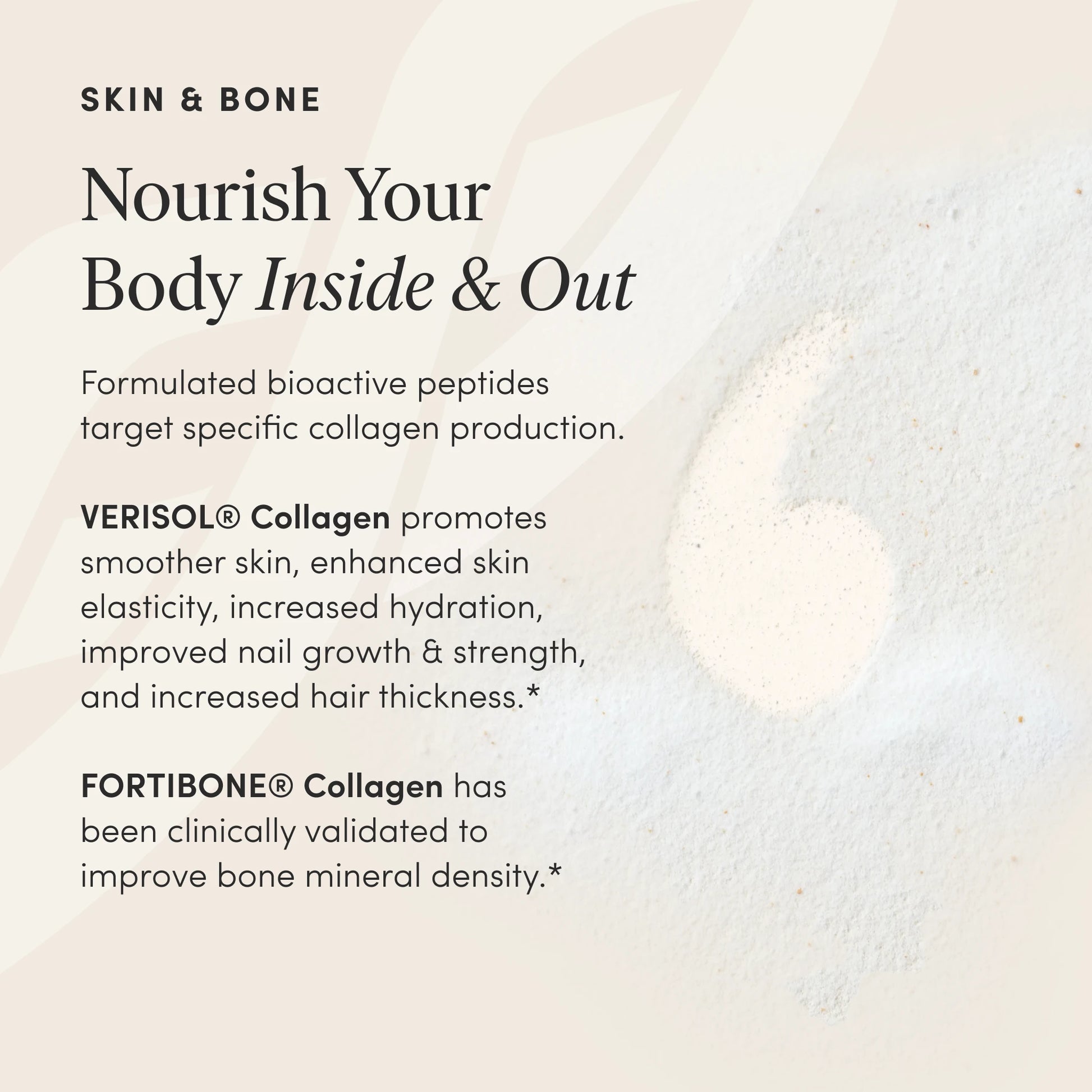 - Skin & Bone Collagen: VERISOL® and FORTIBONE® peptides, NutraC® Vitamin C, Hyaluronic Acid