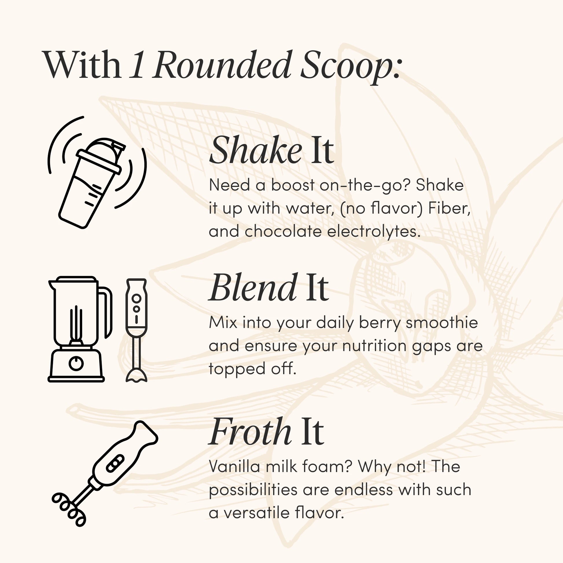Mix 1 rounded scoop with 8–12 fl oz cold water, milk, or a non-dairy alternative.