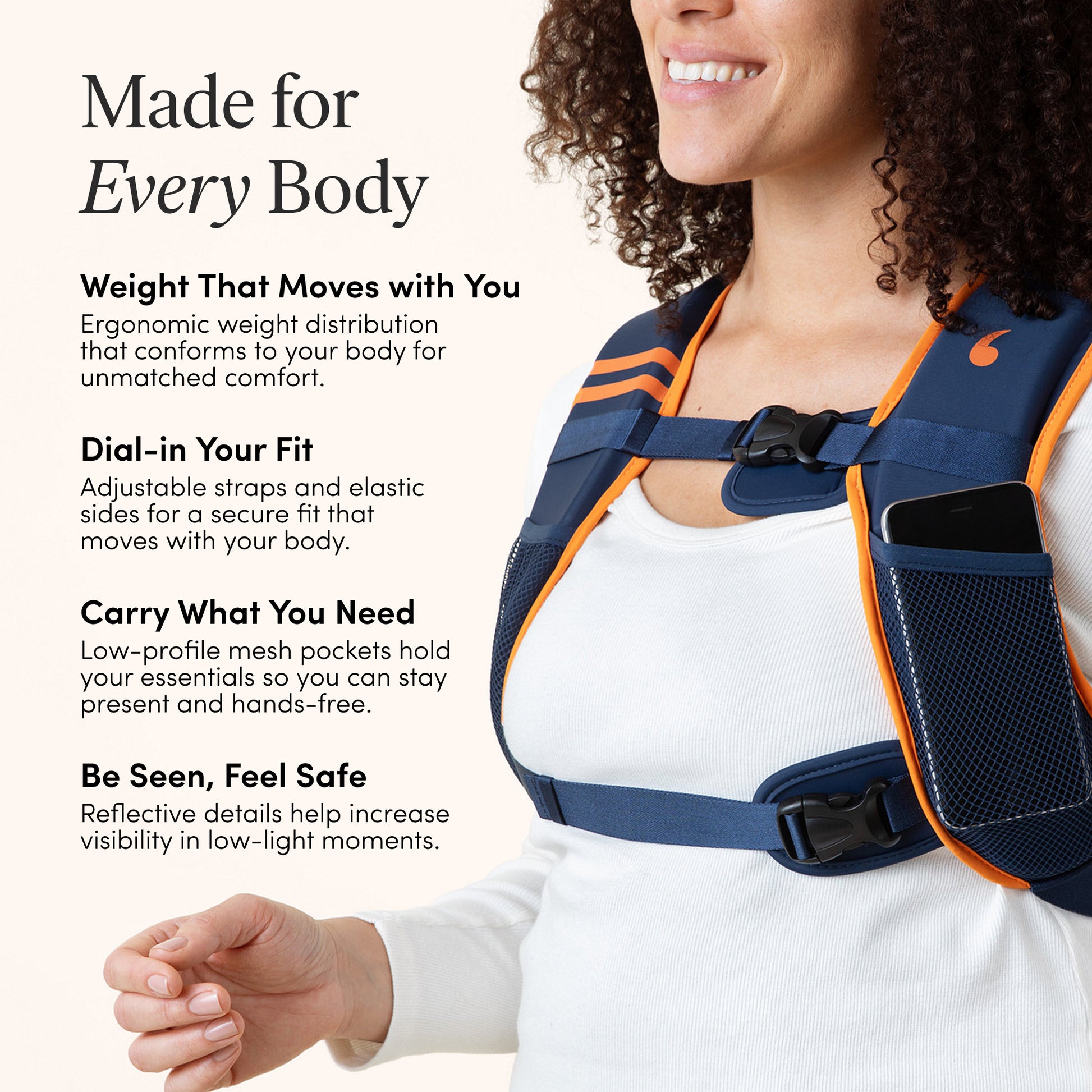 Weighted vest adds load, consult a health professional if you’re pregnant, recently postpartum, have back, hip, knee, musculoskeletal, balance, cardiovascular, pelvic-floor concerns or any concerning medical condition. Discontinue if you exprience discomfort or pain.